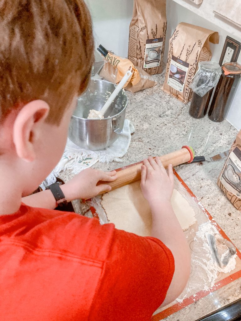 Press into a ball and then roll out to ¼ inch thickness. Use cookie cutters to create shapes. Carefully lift shaped cookies to the baking sheet. Using a flat spatula is recommended to help the cookies maintain their shape.