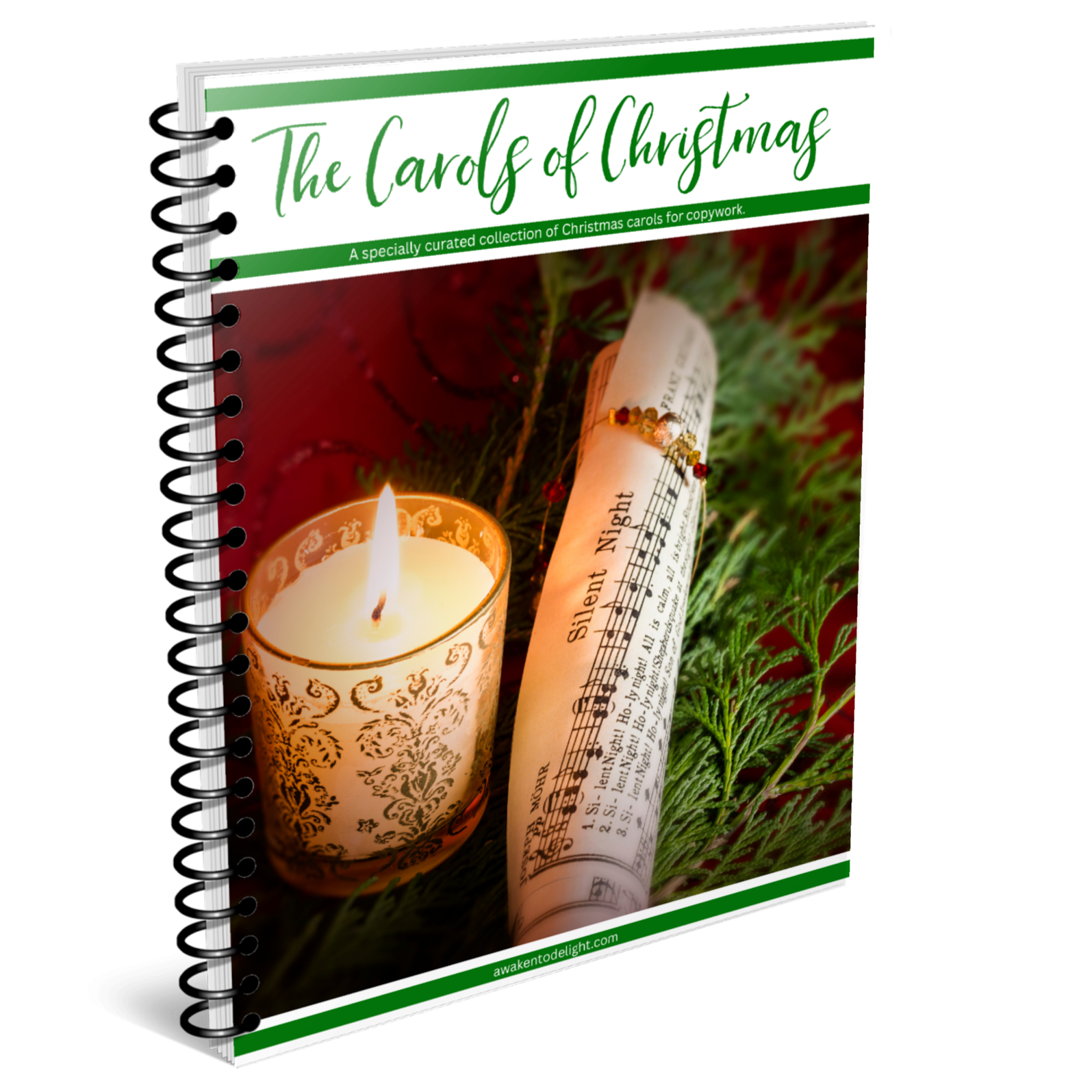 • The Carols of Christmas Copywork Pack Utilize this curated collection of 20 Christian Christmas Carols and hymns to reinforce memorization of beautiful lines as well as for practicing handwriting. Zaner-Bloser style handwriting sheets for all ages (primary, elementary, and cursive, as well as college-ruled for older students &/or moms). (Regular price = $17)