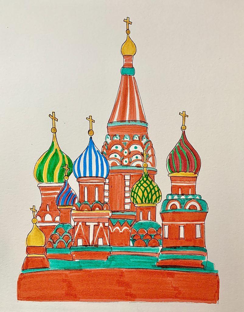 In this curriculum, we have included an art lesson showing how to create Saint Basil’s Cathedral in markers, which is located in Moscow, and is one of the most important buildings to Russian history. It was constructed over the course of 5 years, from 1555 to 1561, however, all of it’s beautiful colors weren’t added until over a century later in 1683. The 9 pillars are built to look like pillars of fire, and the colors were meant to represent the throne of God, which is surrounded by a rainbow. It has now become one of the most famous Russian landmarks! So get out your markers, grab some snacks from our tea time recipes, and enjoy creating your own depiction of this beautiful piece of history!