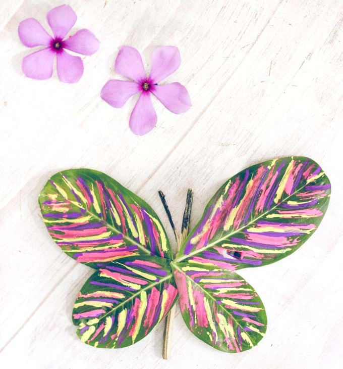 Using a stick, some green leaves, and some paint is a great way to get their hands busy with nature. This fun stick and leaf butterfly craft is a creative craft to make during the summer.